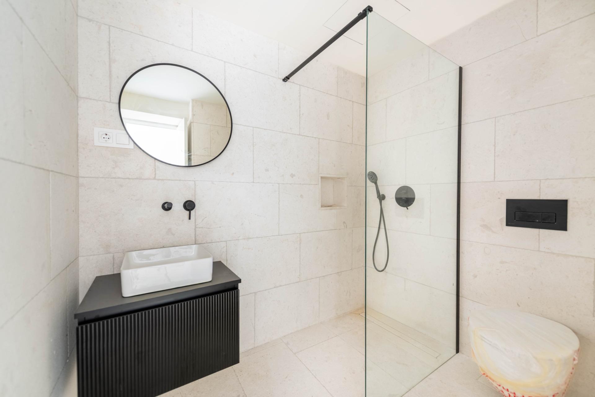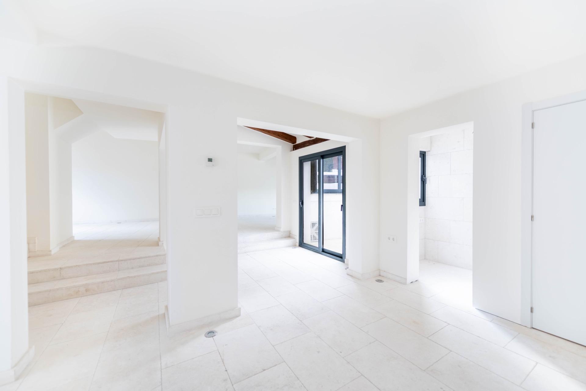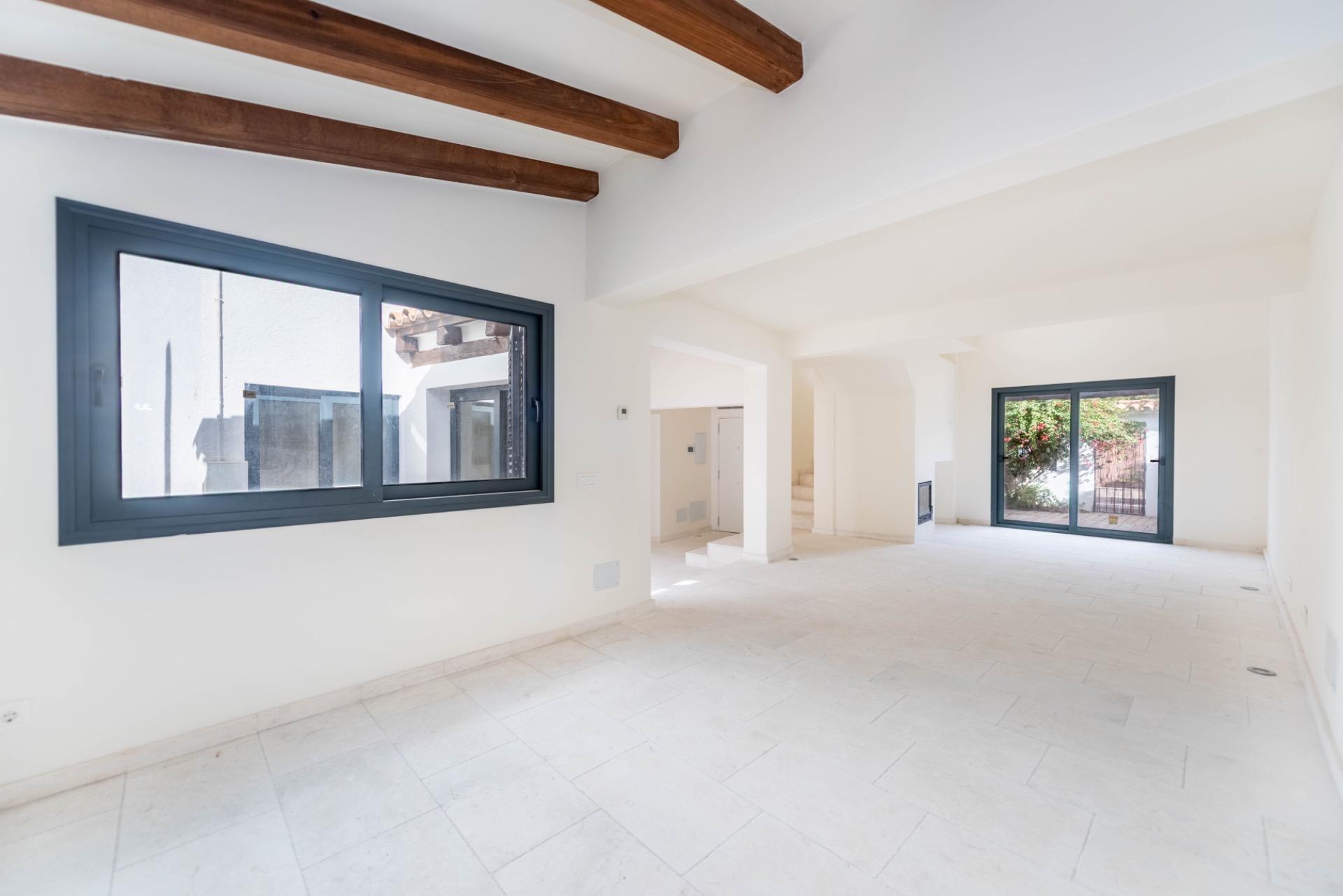 Im Inneren überzeugt das Haus mit einem fließenden Grundriss, in dem die offene Küche mit Essbereich und das großzügige Wohnzimmer mit Kamin direkt mit beiden Patios verbunden sind, was einen natürlichen Übergang zwischen Innen- und Außenbereich schafft. Die obere Etage beherbergt drei Schlafzimmer und zwei Badezimmer und bietet Privatsphäre und Komfort. Die Renovierung ermöglicht es dem zukünftigen Eigentümer, die Küche selbst auszuwählen und zu installieren, wodurch das Herz des Hauses individuell gestaltet werden kann. Die Immobilie wird unmöbliert übergeben, wobei vorhandene Renderings ihr ästhetisches Potenzial und verschiedene Gestaltungsmöglichkeiten veranschaulichen. Ein Gemeinschaftsparkplatz ist ebenfalls vorhanden.